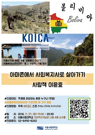 [대학저널 임지연 기자] 서울시립대학교(총장 원윤희) 서울휴먼라이브러리 ‘월간 사람책’ 11월 행사에 사람책 ‘이윤효’ 씨가 초청됐다. 이번 달 사람책의 키워드는 ‘KOICA, 남미, 볼리비아, 사회복지사, 해외봉사’로, 이윤효 씨는 KOICA단원으로 볼리비아에서 2013년부터 3년간 사회복지사로 활동한 다양한 이야기를 독자들과 소통할 예정이다.