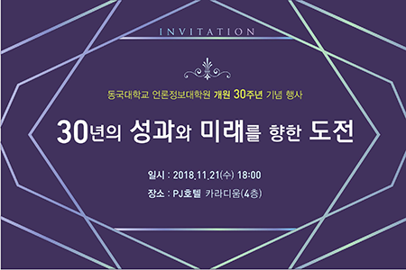 [대학저널 신효송 기자] 동국대학교(총장 한태식) 언론정보대학원(원장 김관규)이 오는 21일 오후 6시부터 PJ호텔 카라디움에서 '30년의 성과와 미래를 향한 도전'이라는 주제로 동국대 언론정보대학원 개원 30주년 기념 행사를 개최한다.