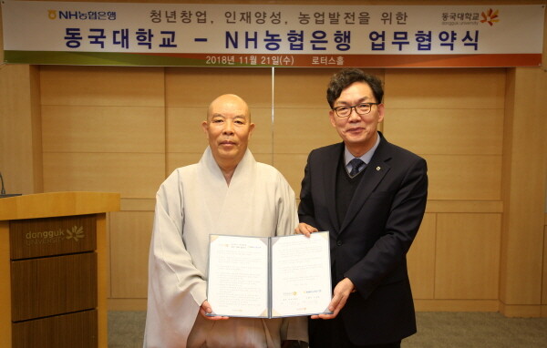 [대학저널 임지연 기자] 동국대학교(총장 한태식)는 지난 21일 동국대 서울캠퍼스 로터스홀에서 NH농협은행(은행장 이대훈)과 상호 발전을 위한 협약을 체결했다. 각 기관들은 청년창업, 인재양성, 농업발전 협력 등에 긴밀히 협력할 방침이다.