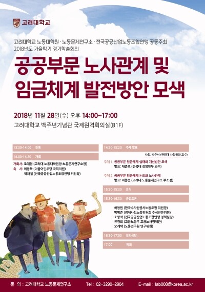 [대학저널 오혜민 기자] 고려대학교 노동대학원과 노동문제연구소(원장 겸 소장 조대엽)는 오는 28일 오후 2시부터 고려대 백주년기념관 국제원격회의실에서 ‘공공부문 노사관계 및 임금체계 발전방안 모색’을 주제로 정기학술회의를 개최한다.