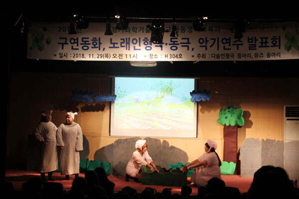 아동영어보육과 전공동아리인 다솜 인형극 동아리 재학생들은 직접 시나리오를 작성해 인형과 소품을 제작하고 목소리를 녹음한 노래인형극(누가 당근을 먹을 수 있을까?)과 동극(빨간모자 쌍둥이)을 진행했다.