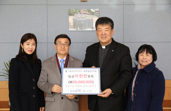[대학저널 김등대 기자] (주)한국에스웨이 조구현 대표와 임원들은 19일 가톨릭관동대학교(총장 황창희) 마리아관 총장실에서 장학금 전달식을 가졌다.