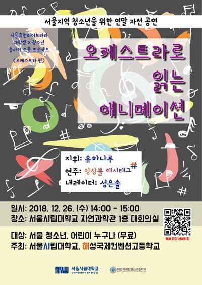 [대학저널 임지연 기자] 서울시립대학교(총장 원윤희)는 오는 26일 서울지역 어린이들을 위해 ‘오케스트라로 읽는 애니메이션’이라는 주제로 오케스트라 자선 공연을 개최한다.