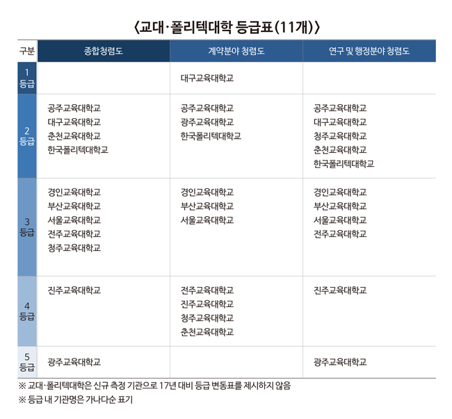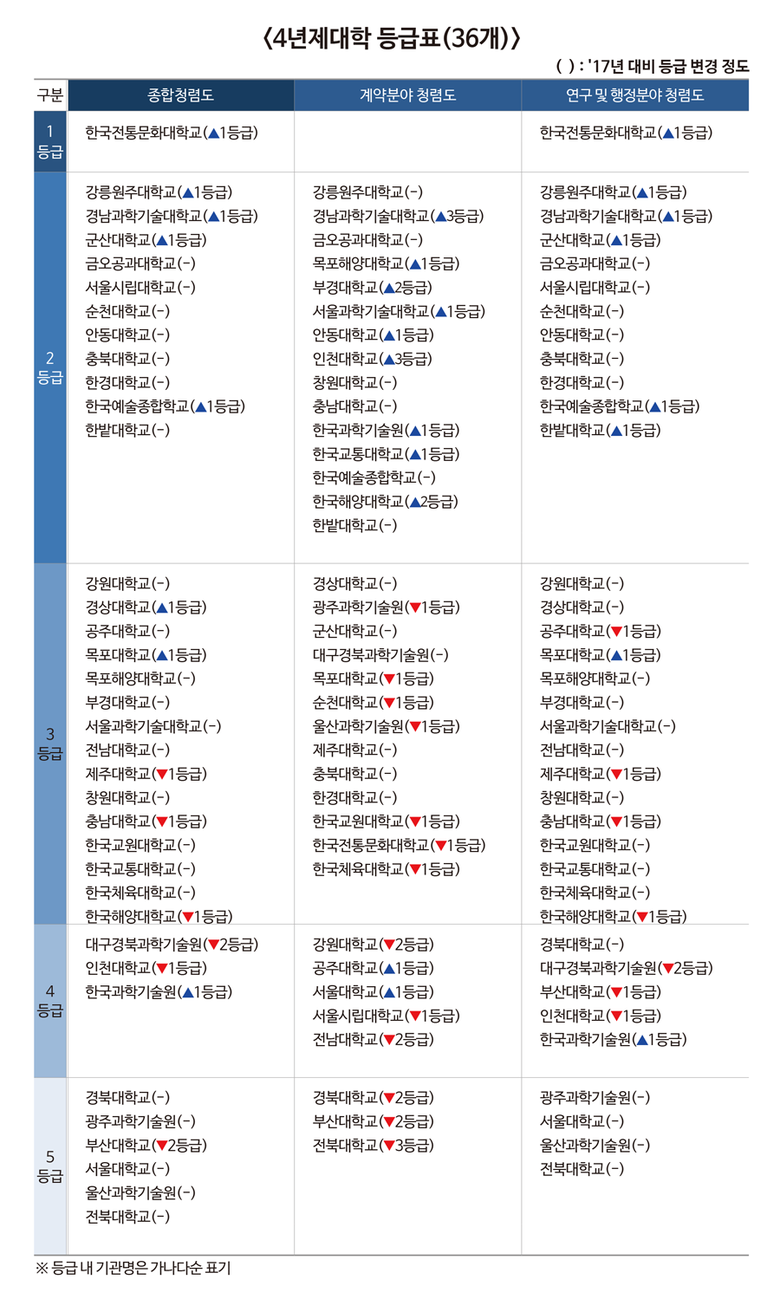 기관별로는 한국전통문화대의 종합청렴도 등급이 최상위인 1등급인 반면, 광주과학기술원, 서울대, 울산과학기술원, 광주교육대 등 7개 대학은 5등급으로 나왔다.