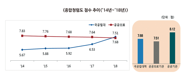 전국 47개 국・공립대학의 종합청렴도는 10점 만점에 7.68점으로, 2017년(6.53점) 대비 1.15점, 2016년(5.92점)과 대비해 평균 1.76점 상승하는 등 지속적으로 향상되고 있는 것으로 나타났다.