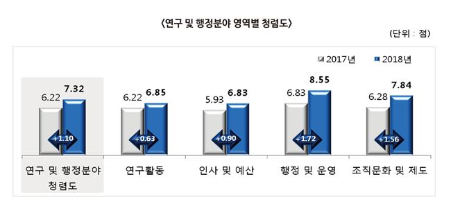 분야별로 살펴보면, 연구·행정분야 청렴도는 7.32점으로 전년 대비 1.10점 상승했으며, 4개 평가영역(연구활동, 인사 및 예산, 행정 및 운영, 조직문화 및 제도) 모두 상승했다.