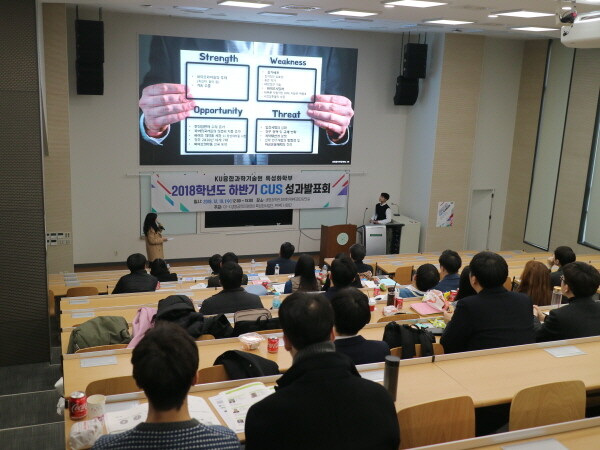 [대학저널 임지연 기자] 건국대학교(총장 민상기) KU융합과학기술원 특성화학부는 지난 19일 건국대 생명과학관 301호 프라임 첨단강의실에서 '수도권 대학 특성화 사업'(CK-II)의 지원을 받아 진행하고 있는 학부생 커리어개발 프로그램(CUS: Career for Undergraduate Students) 성과발표회를 개최했다.