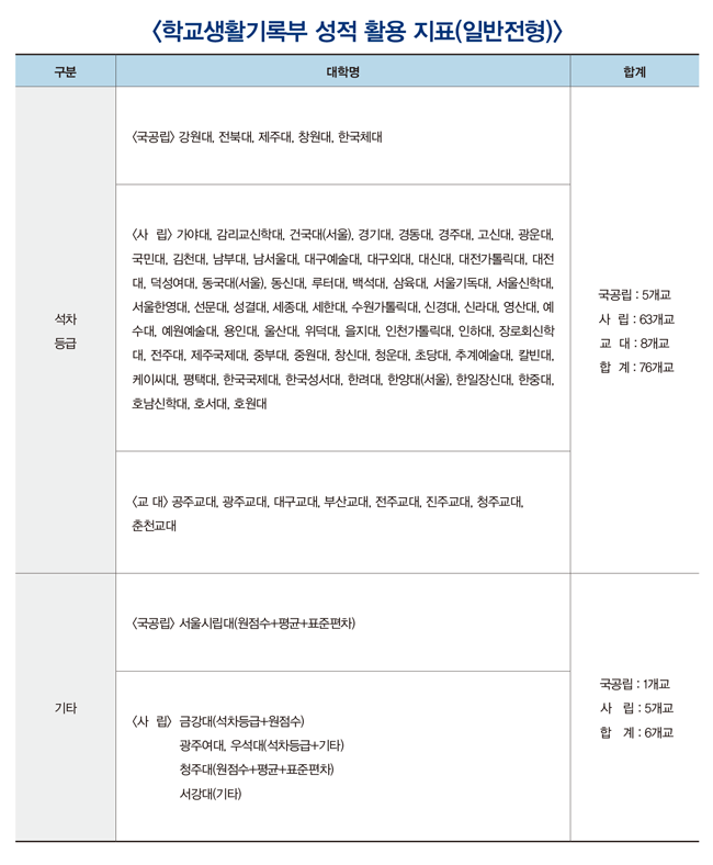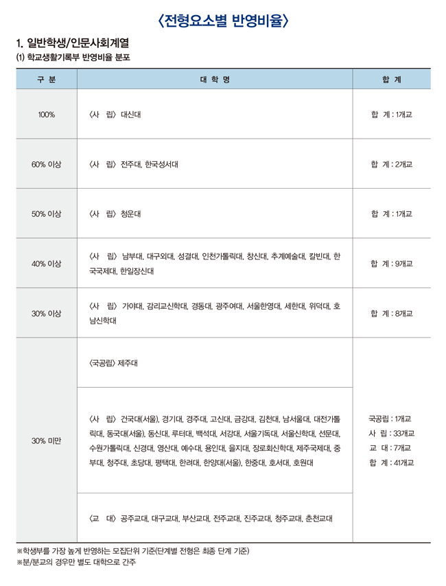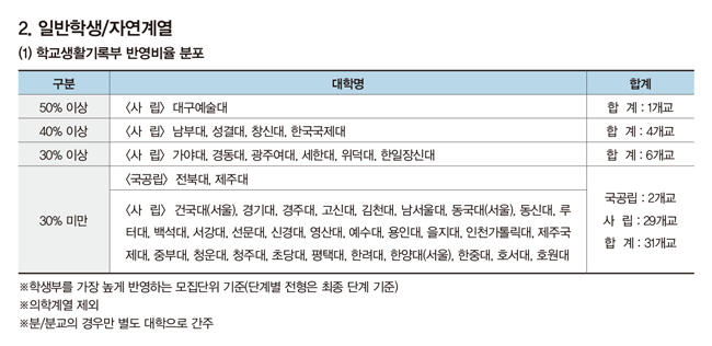 또한 실기 위주 전형으로 9819명(11.8%), 학생부교과전형으로 332명(0.4%), 학생부종합전형으로 445명(0.5%), 기타로 125명(0.1%)이 각각 선발된다. 학생부 반영비율의 경우 일반전형 인문사회계열 기준으로 100% 반영 대학 1개교, 60% 이상 반영 대학 2개교, 50% 이상 반영 대학 1개교, 40% 이상 반영 대학 9개교, 30% 이상 반영 대학 8개교, 30% 미만 반영 대학 41개교다.