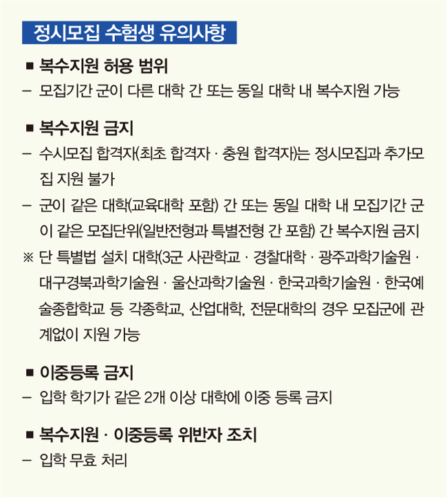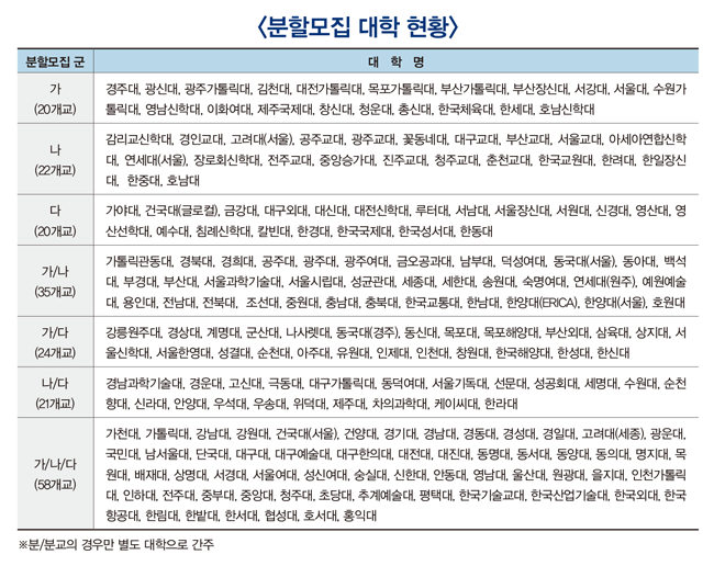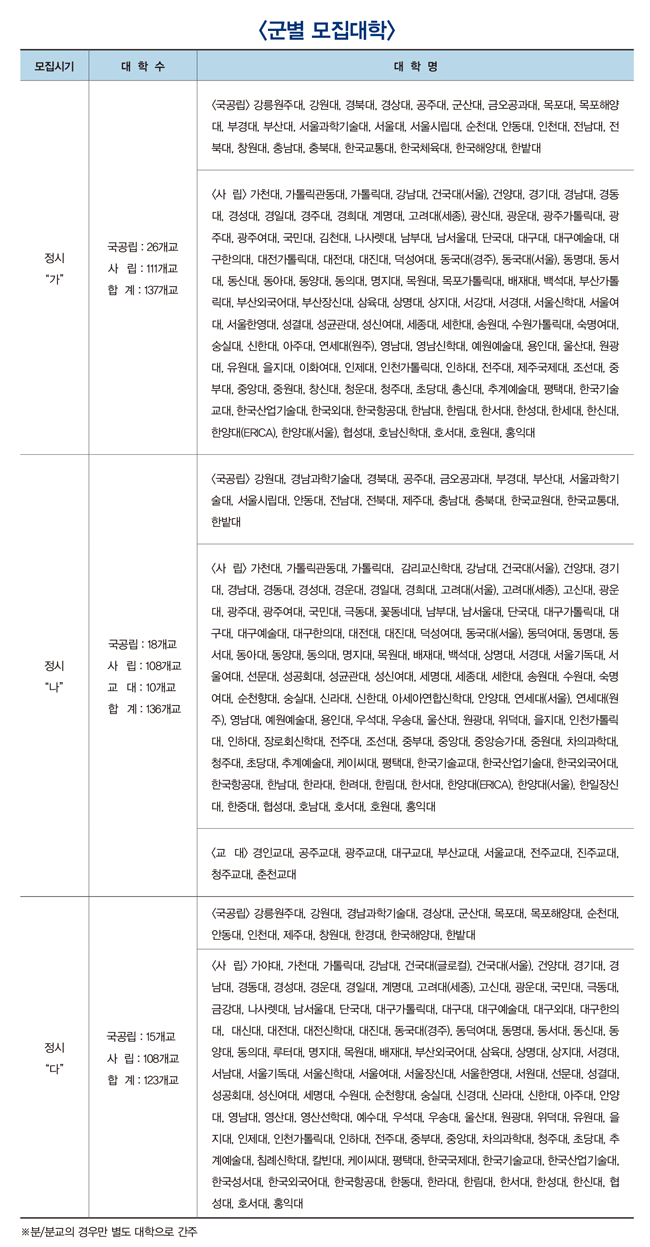 모집군별로는 일반전형은 나군(3만 72명), 가군(2만 9201명), 다군(2만 249명), 특별전형은 가군(1542명), 나군(998명), 다군(910명) 순으로 가장 많이 선발한다.