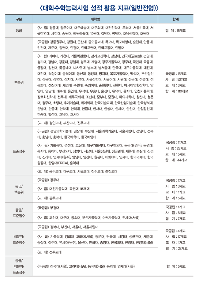 정시모집에서는 수능이 주요 전형요소로 활용된다. 실제 2019학년도 정시모집 전체 인원의 약 87.1%(7만 2251명)가 수능 위주 전형으로 선발된다. 수능 반영비율은 일반전형 인문사회계열 기준으로 100% 반영 대학 124개교, 80% 이상 반영 대학 30개교, 60% 이상 반영 대학 24개교, 50% 이상 반영 대학 6개교, 40% 이상 반영 대학 1개교, 30% 이상 반영 대학 2개교다.
