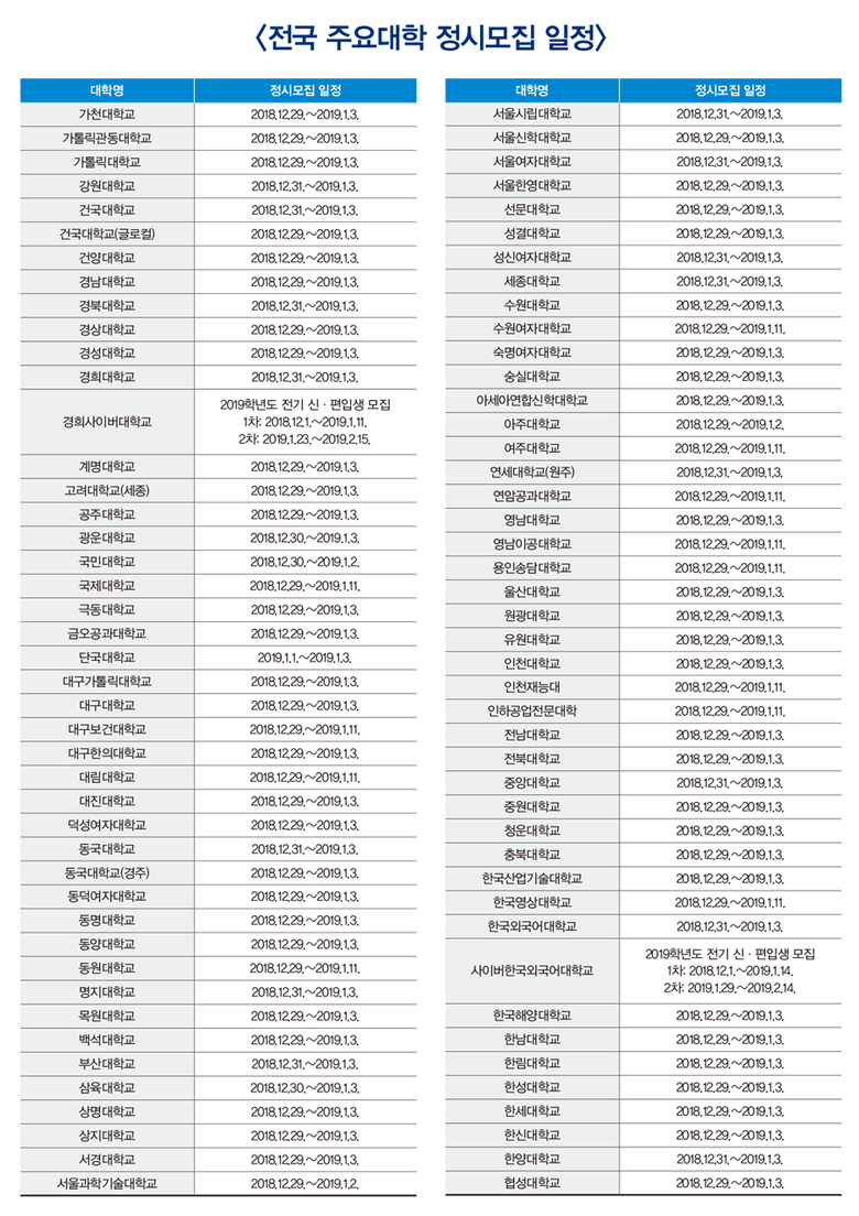 세부내용을 살펴보면 먼저 2019학년도 정시모집 원서접수는 2018년 12월 29일부터 2019년 1월 3일까지 대학별로 3일 이상 실시된다. 모집군별 전형기간은 ▲가군: 2019년 1월 4일~11일 ▲나군: 2019년 1월 12일~19일 ▲다군: 2019년 1월 20일~1월 27일이다. 합격자는 2018년 1월 29일까지 발표된다.