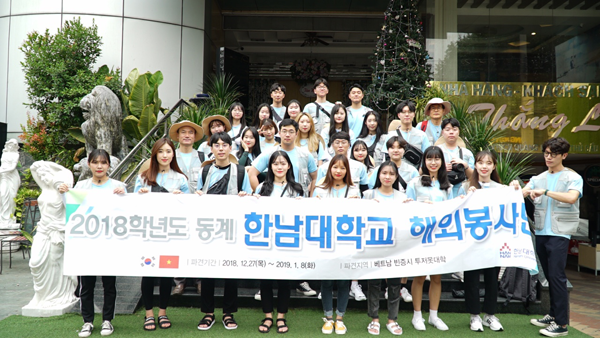 한편 한남대 해외봉사단은 26명의 학생과 3명의 교직원으로 구성돼 2018년 12월 27일부터 베트남 빈증 지역에서 사회복지기관 방문, 한글교육, 태권도교육, 문화공연 등 봉사활동을 실시했다.