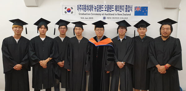 [대학저널 신영경 기자] 아주자동차대학(총장 박병완)은 지난 5일 뉴질랜드의 자동차정비회사에 취업한 졸업생들을 위해 ‘찾아가는 뉴질랜드 해외 졸업식’ 행사를 진행했다.