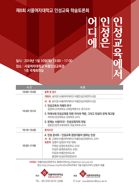 참가신청은 서울여대 바롬인성교육연구소 홈페이지(http://ibahrom.swu.ac.kr)에서 가능(자료집은 사전접수자 우선 배부)하며 현장접수도 가능하다.