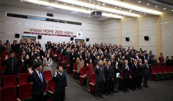 [대학저널 신영경 기자] 김포대학교(총장 김재복)는 지난 7일 국제관 대회의실에서 전홍건 이사장, 김재복 총장을 비롯한 전 교직원과 학생 대표 등 180여 명이 참석한 가운데 ‘VISION HOPE 2025 선포식’을 거행했다.