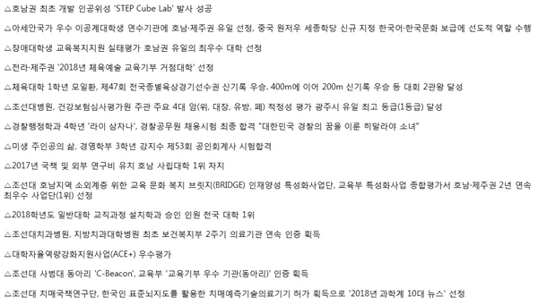 [대학저널 김등대 기자] 조선대학교가 '조선대를 빛낸 소식 15'를 선정해 발표했지만 학내 분위기는 냉소적이다. '내부 치적을 홍보하는데 힘 쓰기보다 대학 혁신을 위한 노력에 전력할 때'라는 것이다.