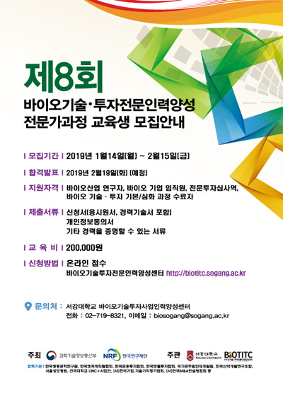 [대학저널 김등대 기자] 서강대학교(총장 박종구) 바이오기술·투자전문인력양성사업단(이하 BIOTITC)이 '바이오기술·투자전문인력양성 전문가과정' 교육생을 모집한다.