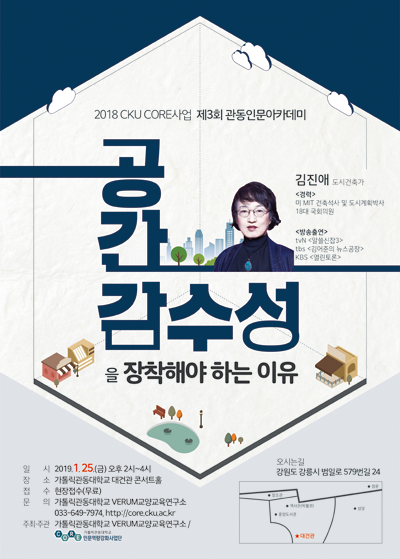 [대학저널 김등대 기자] 가톨릭관동대학교(총장 황창희) VERUM 교양교육연구소와 인문역량강화사업(CORE)단은 오는 25일 가톨릭관동대 대건관에서 도시건축가 김진애 박사를 초청해 '공간감수성을 장착해야 하는 이유'를 주제로 「제3회 관동인문아카데미」인문학 특강을 개최한다.