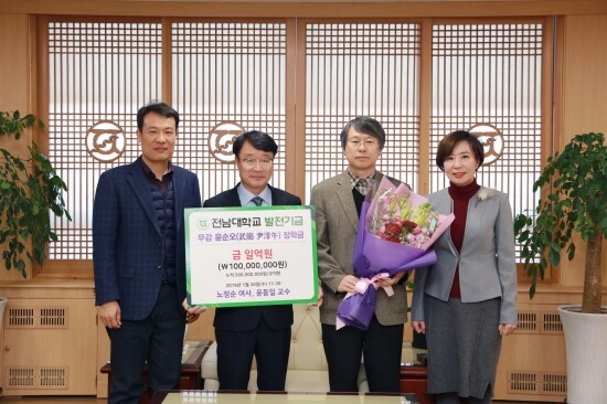 순천제일대 윤동일 교수는 지난 30일 모교인 전남대를 찾아 정병석 총장에게 ‘선부(先夫)의 유지를 잘 전해달라’는 어머니 노정순 여사(86)의 뜻과 함께 장학금 1억 원을 전달했다.