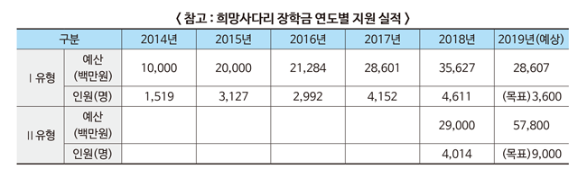 희망사다리 장학금은 중소·중견기업 취업 희망 학생을 지원하는 Ⅰ유형과 고졸 후 중소·중견기업 재직자의 후학습을 지원하는 Ⅱ유형으로 나뉜다.