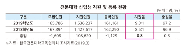 한국전문대학교육협의회(회장 이기우·인천재능대 총장)는 지난 2일 2019학년도 전문대학 입시 결과를 발표했다. 자료를 살펴보면 2019학년도 전문대 지원자는 153만 6237명으로 전년보다 10만 8620명이 증가했다. 평균 경쟁률은 9.3대 1로 전년 대비 0.8% 늘어났고, 충원율도 97.2%로 0.3% 상승했다.