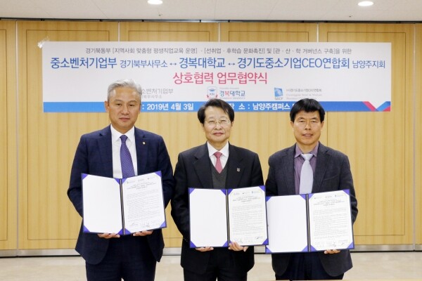 [대학저널 오혜민 기자] 경복대학교는 지난 3일 경복대 남양주캠퍼스에서 중소벤처기업부 경기북부사무소, 경기도중소기업CEO연합회 남양주지회와 지역사회 맞춤형 평생직업교육 운영을 토대로 선취업·후학습 문화를 촉진하고 지속적인 관·산·학 거버넌스 구축을 위한 다자간 상호협약을 체결했다.