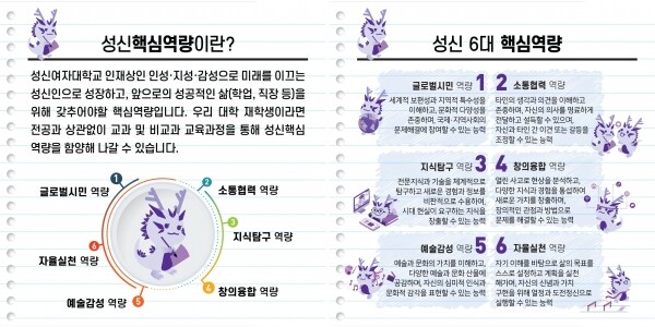 성신여대는 올해 대학의 새로운 인재상을 ‘인성·지성·감성으로 미래를 이끄는 성신인’으로 재정립하는 한편 인재상 달성을 위해 ▲글로벌시민 ▲소통협력 ▲지식탐구 ▲창의융합 ▲예술감성 ▲자율실천 역량의 6대 핵심역량이 필요하다고 규정했다.