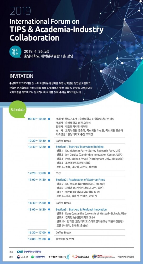 [대학저널 오혜민 기자] 충남대학교(총장 오덕성)는 오는 26일 오전 9시 충남대 대학본부 강당에서 ‘International Forum on TIPS & Academia-Industry Collaboration’을 개최한다.