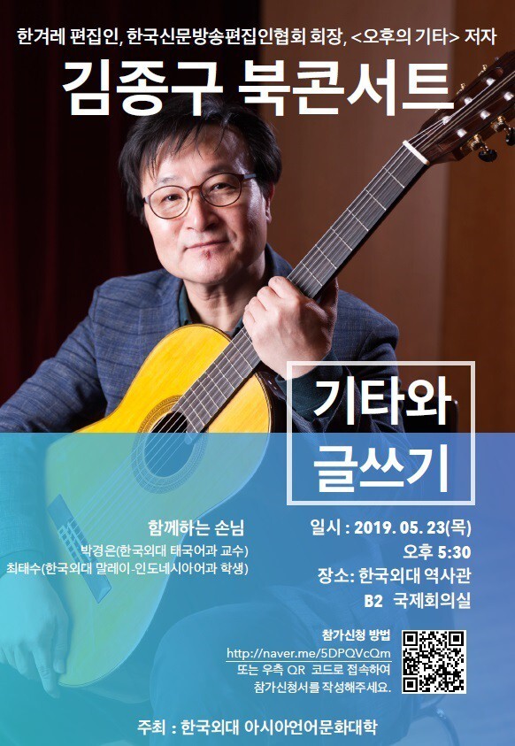 [대학저널 오혜민 기자] 한국외국어대학교(총장 김인철) 아시아언어문화대학은 김종구 한겨레 편집인(한국신문방송편집인협회 회장)을 초청해 23일 오후 5시30분 한국외대 서울캠퍼스 국제회의실에서 ‘북콘서트’를 개최한다.