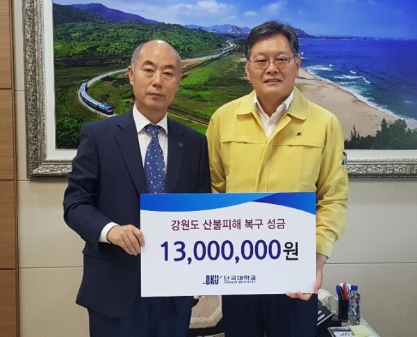 [대학저널 오혜민 기자] 단국대학교(총장 장호성)는 23일 오전 11시 관학협력을 맺은 자매도시인 강원도 고성군을 찾아 산불피해복구성금 1300만 원을 전달했다. 성금은 장호성 총장을 대신해 윤응구 총무인사처장이 이경일 군수에게 전달했다.
