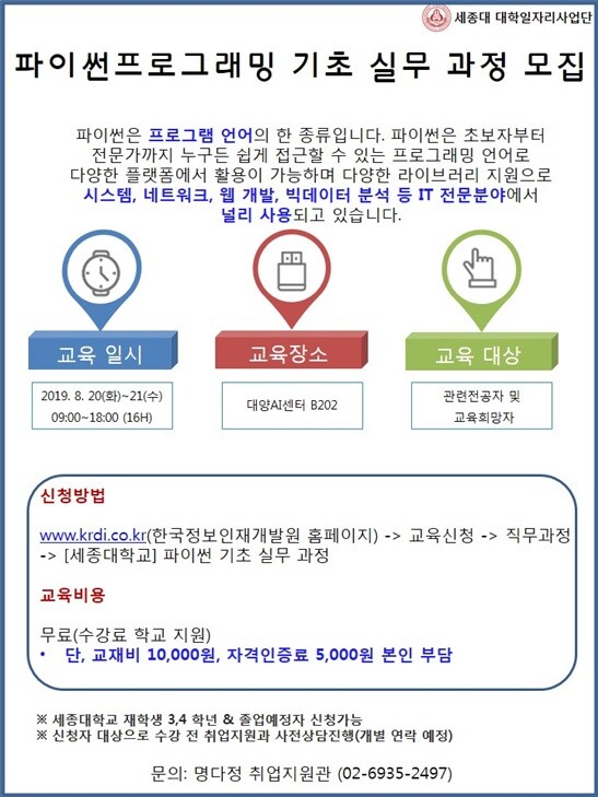 [대학저널 백두산 기자] 세종대학교(총장 배덕효) 대학일자리사업단이 파이썬 프로그래밍 기초 실무 과정 참여자를 모집한다.