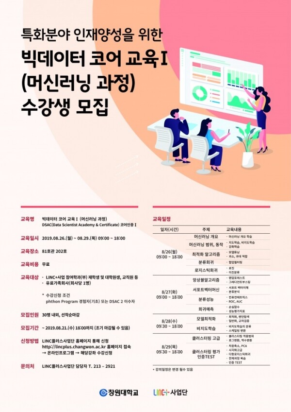 [대학저널 임지연 기자] 창원대학교 LINC+사업단은 특화분야 인재양성을 위한 ‘빅데이터 코어교육(머신러닝 과정)’을 실시한다.