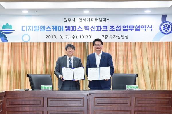 [대학저널 임지연 기자] 연세대학교 원주(미래)캠퍼스가 교내 산학협력 부지를 활용해 ‘디지털헬스케어 캠퍼스 혁신파크 조성’ 사업에 도전한다. 이를 위해 7일 원주시청 7층 투자상담실에서 원창묵 원주시장과 윤영철 연세대 원주부총장이 동 사업을 위한 상호 협력을 다짐하는 협약식을 개최했다.