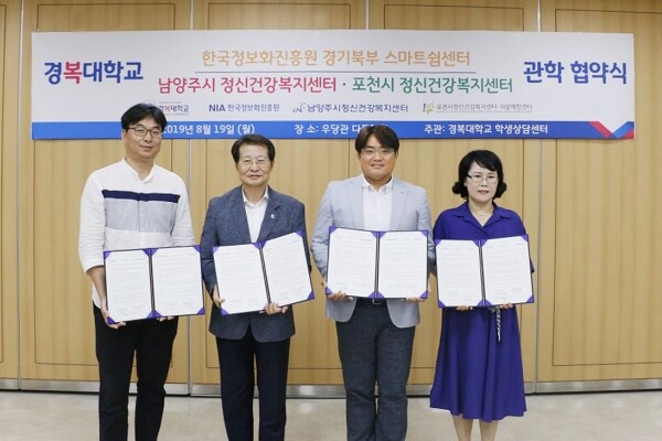 [대학저널 이승환 기자] 경복대학교 학생상담센터는 19일 남양주캠퍼스에서 한국정보화진흥원 경기북부 스마트쉼센터, 남양주시·포천시 정신건강복지센터 등 3개 기관과 상호협력을 위한 관학 협약식을 체결했다.