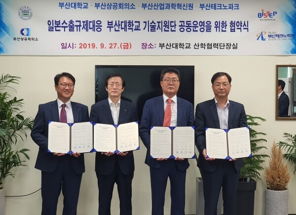 부산대학교 산학협력단(단장 윤석영, 재료공학부 교수)은 27일 교내 삼성산학협동관 산학협력단장실에서 부산상공회의소·부산테크노파크·부산산업과학혁신원과 공동으로 일본 수출규제에 대응하는「부산대 기술지원단」을 운영하기로 하고 협약을 체결했다.