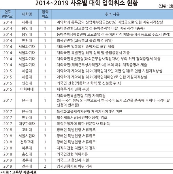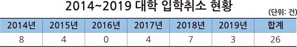 국회 교육위원회 소속 더불어민주당 박경미 의원이 교육부가 제출한 ‘2014~2019 대학 입학취소 현황’을 분석한 결과, 2014년부터 2019년까지 대학 입학이 취소된 사례는 26건으로, 2014년 8건, 2015년 4건, 2017년 4건, 2018년 7건, 2019년 3건으로 나타났다.