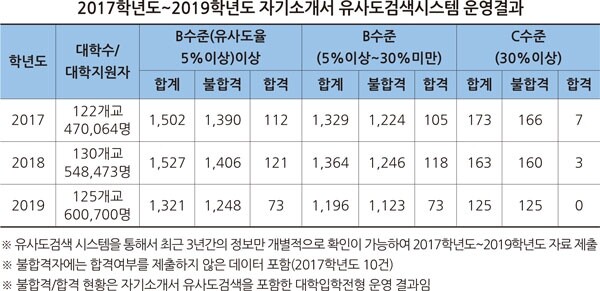 2019학년도 125개 대학 60만 700명의 자기소개서 유사도검색 결과 유사도율이 5% 이상에서 30% 미만인 학생은 1,196명이었고 이 중 73명이 합격했으며 유사도율이 30% 이상 수준 학생은 125명이었으나 합격한 학생은 없었다.