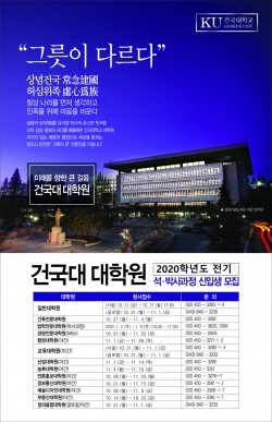 [대학저널 백두산 기자] 건국대학교 대학원(원장 정일민)은 10월11일부터 21일까지 2020학년도 전기 석·박사 과정 신입생을 모집한다. 경영전문대학원(MBA)과 건축전문대학원 등 전문대학원과 야간과정 특수대학원도 10월 14일 부동산대학원의 원서접수를 시작으로 각 대학원별로 신입생을 모집한다.