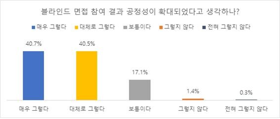 블라인드 면접에 관한 수험생들의 반응은 대체로 긍정적이다. 블라인드 면접 참여 결과 공정성이 확대됐다고 생각한다는 응답이 81.2%(매우 그렇다 40.7%, 대체로 그렇다 40.5%)였고, 본인에게 공정한 평가라고 생각하는 비율도 85.2%(매우 그렇다 42.3%, 대체로 그렇다 42.9%)에 이르렀다.(출처: 학생부종합전형 평가 공정성 확보 방안 연구, 단국대, 명지대, 서울여대 공동연구, 2018 고교교육 기여대학 지원사업) 2019학년도 서울시립대학교 면접 출구조사 결과 역시 마찬가지였는데 ‘블라인드 면접 및 서류기반 확인 면접은 공정하다고 생각한다’는 비율이 무려 95%를 상회했다.(출처: 서울시립대학교 2019학년도 학생부종합전형 운영사례)