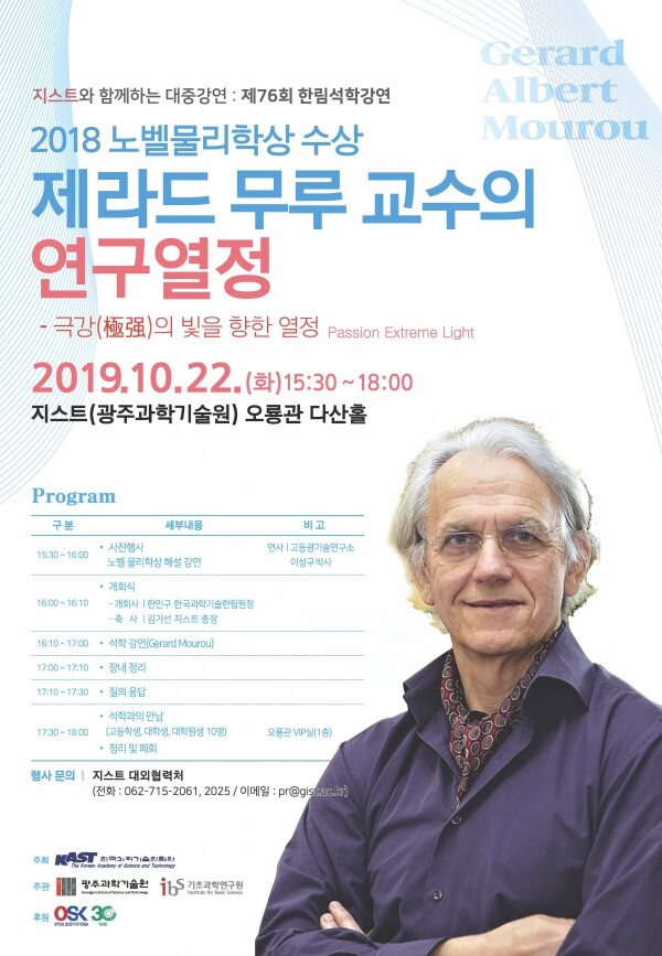 한편 강연 전에는 사전행사로 학생과 일반인들의 이해를 높이기 위해 이성구 GIST 고등광기술연구소 박사의 ‘노벨 물리학상 해설강연’이 진행되며, 강연 이후에는 무루 교수와 국내 이공학도 10명 간 ‘석학과의 만남’이 별도 마련된다.