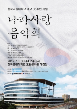 [대학저널 백두산 기자] 한국교원대학교(총장 류희찬)는 개교 35주년을 기념해 10월 30일 오후 5시에 교원문화관 대강당에서 ‘개교 35주년 기념 나라사랑 음악회’를 개최한다.