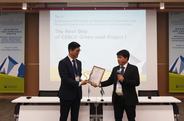 [대학저널 이승환 기자] 공주대학교(총장 원성수) 생물교육과 장창기 교수는 17일 산림청 국립수목원에서 개최된 '2019 중앙아시아 생물다양성 보전을 위한 국제심포지엄'에서 Uzbekistan Academy of Science, Institute of Botany로부터 학술적 공로를 인정받아 명예교수로 추대받았다고 29일 밝혔다.(사진설명 :왼쪽 장창기 교수가 명예교수 추대증서를 받는 모습)