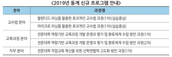 특히 이번 동계연수에서는 4차 산업혁명 시대에 맞는 교수법으로 주목을 받고 있는 PBL, 플립러닝 외 신규교수법 2개 과정을 추가로 개설했으며, 전문대학의 역량기반 교육과정 개발과 운영 질 관리 사례를 통해 교육혁신 방안을 모색하기 위한 정보 공유 기회도 제공할 예정이다.