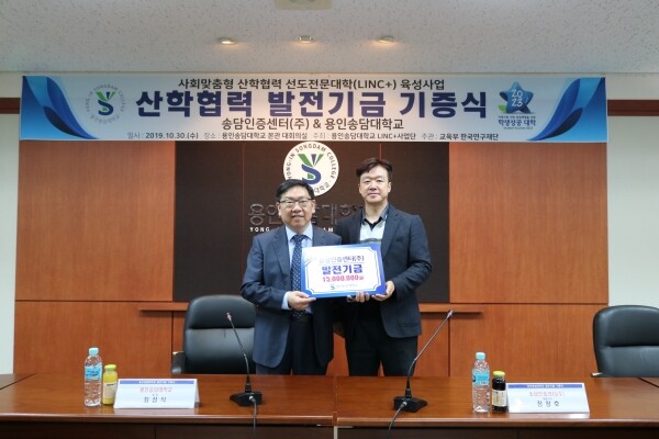 [대학저널 이승환 기자] 송담인증센터(주)(대표 장창호)는 10월 30일 용인송담대학교(총장 최성식)에 대학 발전기금 1,500만원을 전달했다.