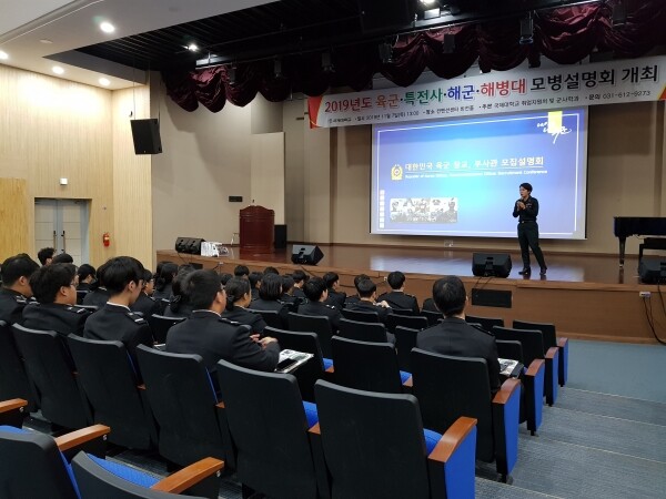[대학저널 이승환 기자] 국제대학교(총장 김방) 대학일자리센터는 7일 국제컨벤션센터 비전홀에서 재학생 대상 다양한 직업세계 진출을 위해 ‘2019년도 각 군 모병설명회’를 개최했다.