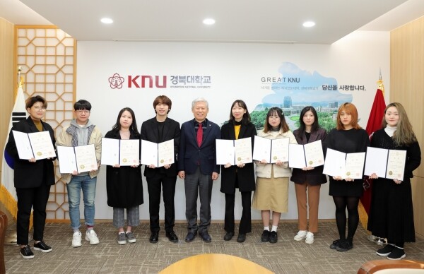 경북대는 지난 4월 대학 구성원(학생, 교직원, 동문 등)을 대상으로 대학 상징동물인 호반우를 활용한 ‘경북대학교 캐릭터 및 캐릭터마크 공모전’을 실시했다. 캐릭터 부문에는 85개의 작품과 캐릭터마크 부문에는 40개의 작품이 접수됐다. 2차례의 선호도 조사와 1, 2차 심사 등을 거쳐 각 부문별로 대상 2명을 포함한 10명(대상 2명·최우수상 2명·우수상 2명·장려상 4명)의 수상자을 선정했다. 시상식은 지난 20일 경북대 총장실에서 열렸다.