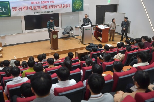 [대학저널 이승환 기자] 건국대학교는 23일 2020학년도 대입 수시모집 학생부종합 면접고사를 실시했다. 면접진행요원들이 수험생들에게 블라인드 면접평가를 안내하고 있다.