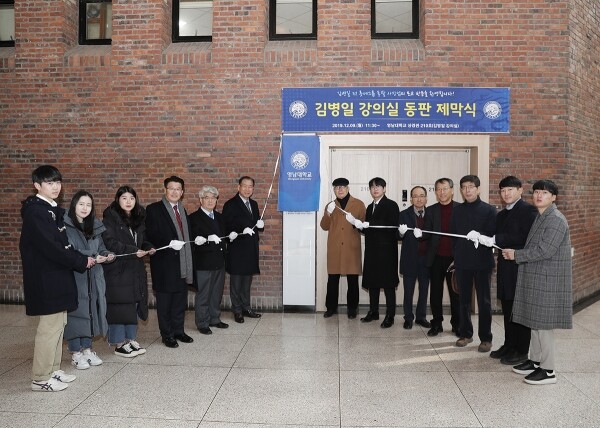영남대는 9일 오전 상경관 210호에서 ‘김병일 강의실’ 네이밍 동판 제막식을 가졌다. 강의실 출입문 좌측 벽면에 김 전 사장의 주요 이력이 포함된 네이밍 동판을 부착했다.