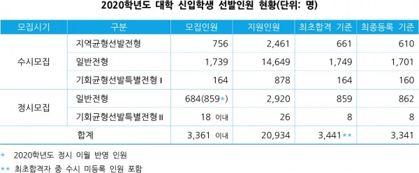 정시모집에서는 일반전형 862명, 기회균형선발특별전형Ⅱ 8명(특수교육대상자 6명, 북한이탈주민 2명) 등 총 870명을 선발했다.