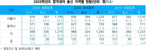 지역에 따른 격차는 다소 줄어든 것으로 나타났다. 2019학년도 서울시 출신 학생은 1,210명(36.7%)였으나 2020학년도는 1,199명(36.3%)로 11명 줄었으며, 광역시 출신은 711명(21.5%)에서 677명(20.5%)으로 34명 줄었다. 반면 시‧군 출신은 1,380명(41.8%)에서 1,427명(43.2%)으로 47명 증가했다.